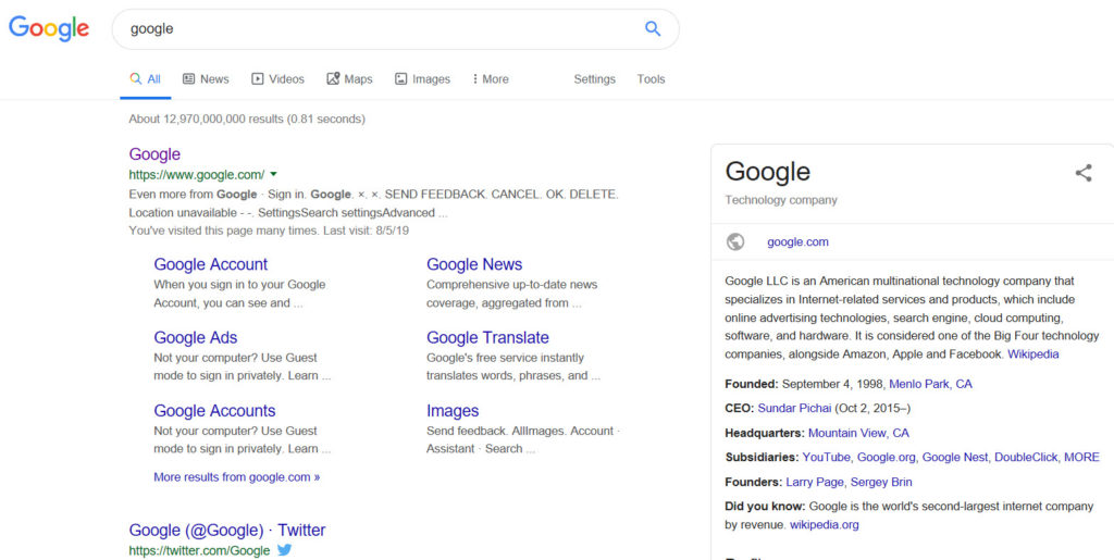 If an established brand, consumers are likely to see a large box on the right side of the page with company incidentals — what Google and the algorithm have gleaned, e.g., owner, headquarters, inception date, picture/logo, stuff like that. On the left side of the page is information more controlled by the user — typically beginning with copy from meta tags and labels associated with the home page. Other copy is hopefully scraped from paragraphs about what the brand Is and what the brand Does (Is-Does) often included there are some other organizing subheads like: About, Careers, Location. This area can be a mess of copy and bullet — not the best presentation of a brand and its value.