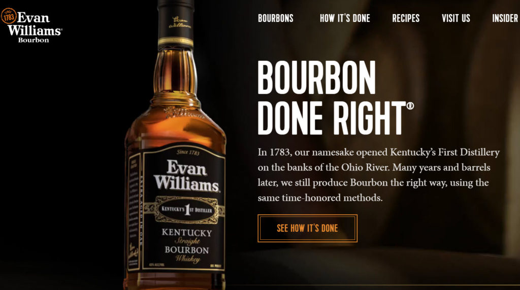 The construct “done right” has been used in taglines in every product category since modern marketing began. It’s so overused it has lost all marketing flavor. Plus, it presumes there are lots of bourbons done wrong. In addition to using a commodity tagline, “done right” is hard to prove. With a cursory look at the Evan Williams website, the only proof laid out to support the claim is aged in charred oak barrels. And aged for 4 years. Kentucky’s first bourbon doesn’t directly support the claim, though it’s a proof (of something).
