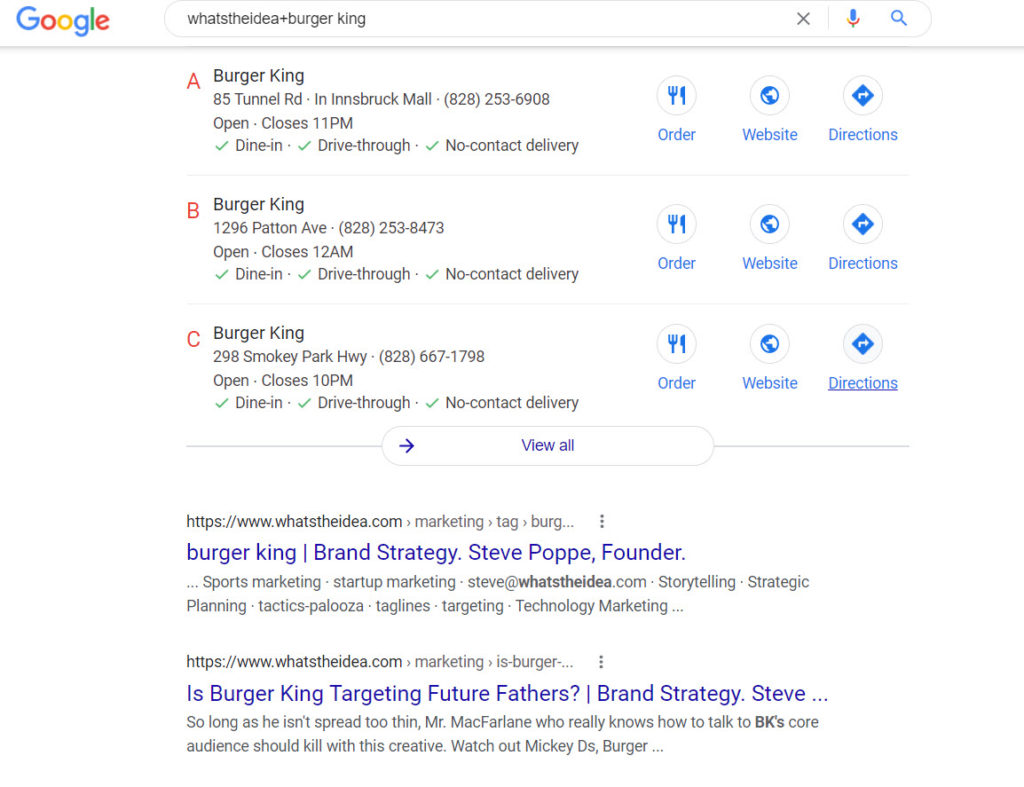 Every morning I try to blog about branding. To date I have somewhere north of 2850 posts. One of the tricks I use to build make blog more visible and build followers is to index each post with my consultancy brand What’s The Idea? In search terms that means I tag whatstheidea, one word, to every blog — along with whatever else I happen to be writing about. My intent is to be able to tell people to Google whatstheidea and another word or brand using the plus sign (e.g., whatstheidea+burger king) and they will be one click away from my writings and thoughts.