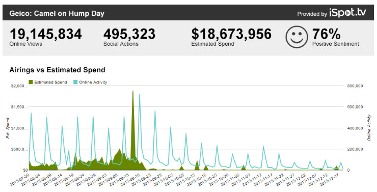 Here’s an example of a twitch the Geico Insurance and The Martin Agency may or may not have designed into the famous Hump Day TV spots. Lots of people like the Hump Day spots — the boisterous, roaming camel asking “Guess what day it is?” This spot from the campaign has over 19M views on YouTube. Do you know what day these spots are shared the most? Wednesday.